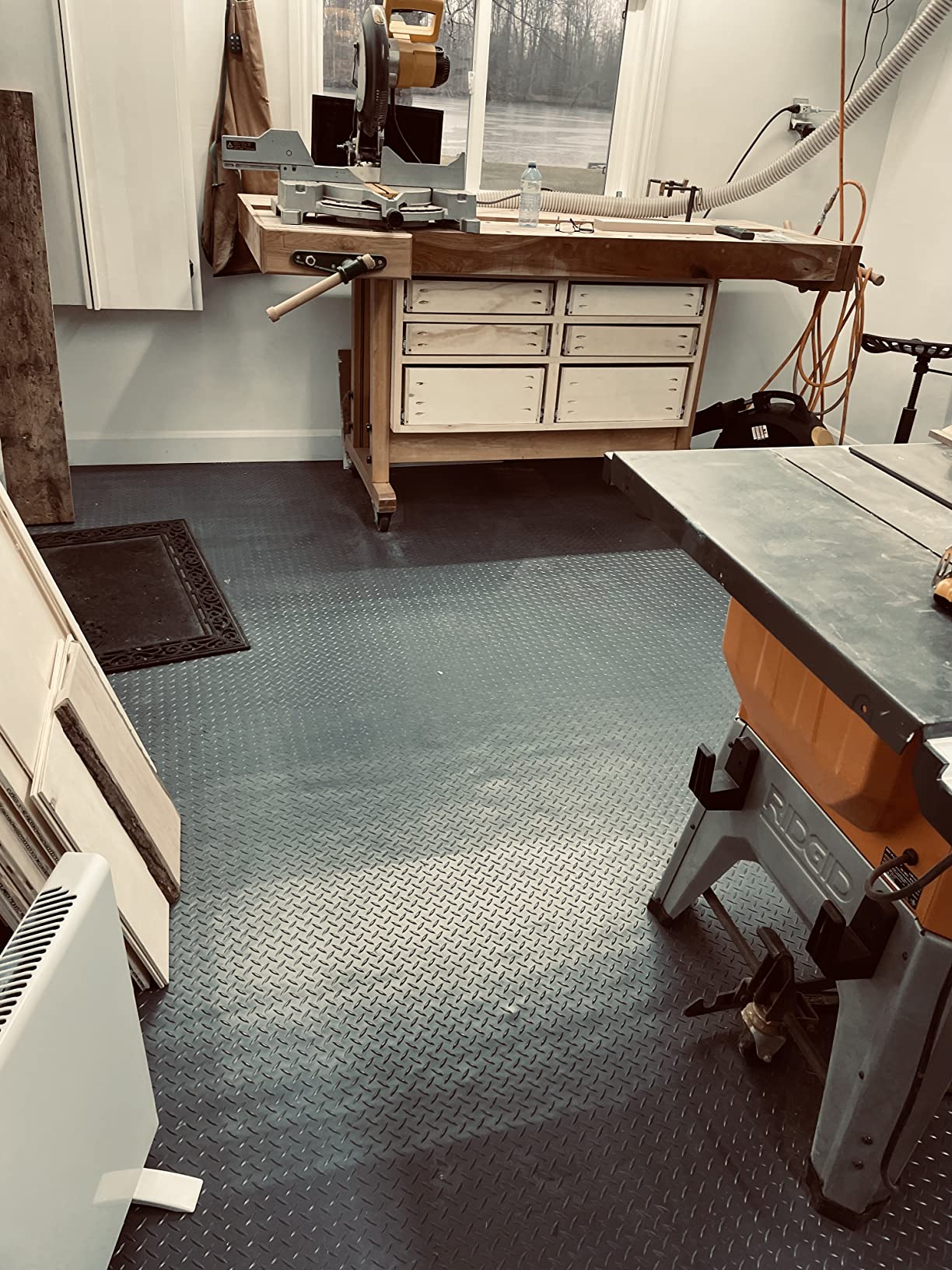 The flooring arrived quickly and we were able to lay it all out and complete the whole project in half a day. The flooring itself is perfect for our multi use shop that’s often got motorcycle rebuilds, tool repair and various projects all going at once. It’s easy to clean and with the right lighting, brightened up the shop making it easier to see what you are working on (and to find the small screw you dropped…) Even our very large Shop Dogs love it 🙂